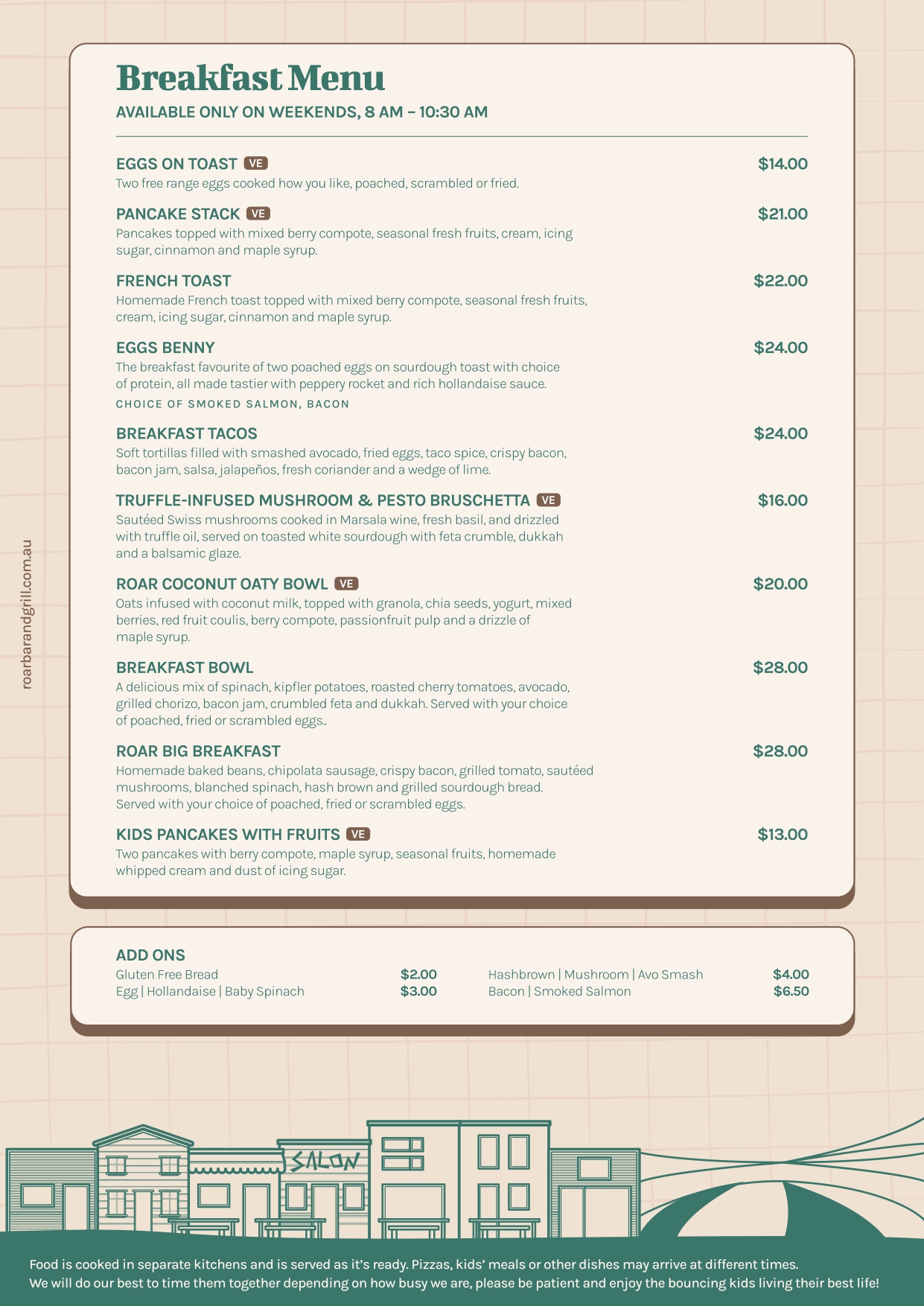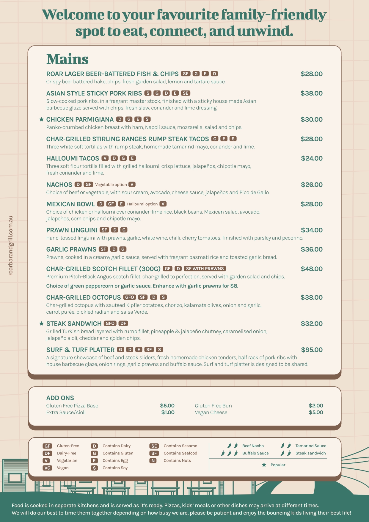 ROAR Bar and Grill is a vibrant place to come and socialise, share good food and drinks, with a massive outdoor kids play area to keep the little ones entertained.