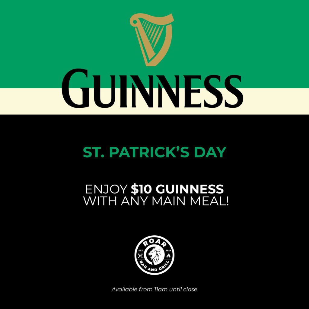 For the whole week, from 11am to close, enjoy $10 Guinness pints when you order any main meal. Wear a touch of green — settle in for lunch, stay for dinner and raise a glass to St Paddy’s.